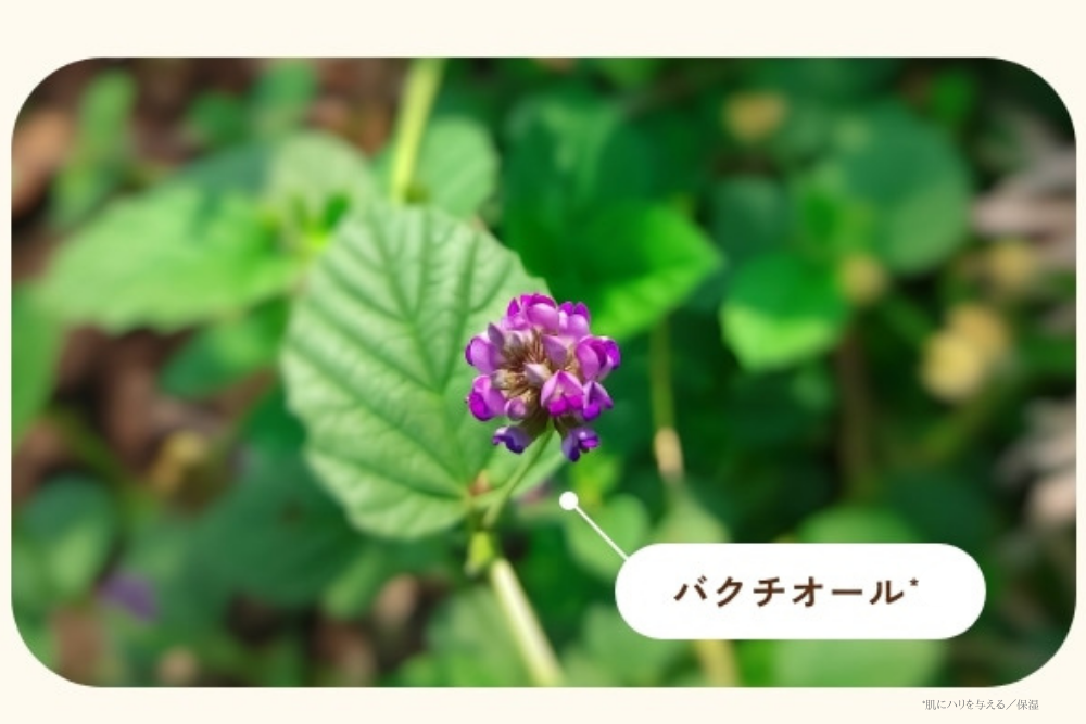 肌をすこやかに保ち、乾燥によるハリ不足を防ぐサポート成分として注目されています。また、バクチオールは紫外線の影響を受けないため、朝のお手入れにも使える点も魅力のひとつです。乾燥しやすい季節や敏感肌の方にも取り入れやすい成分です。