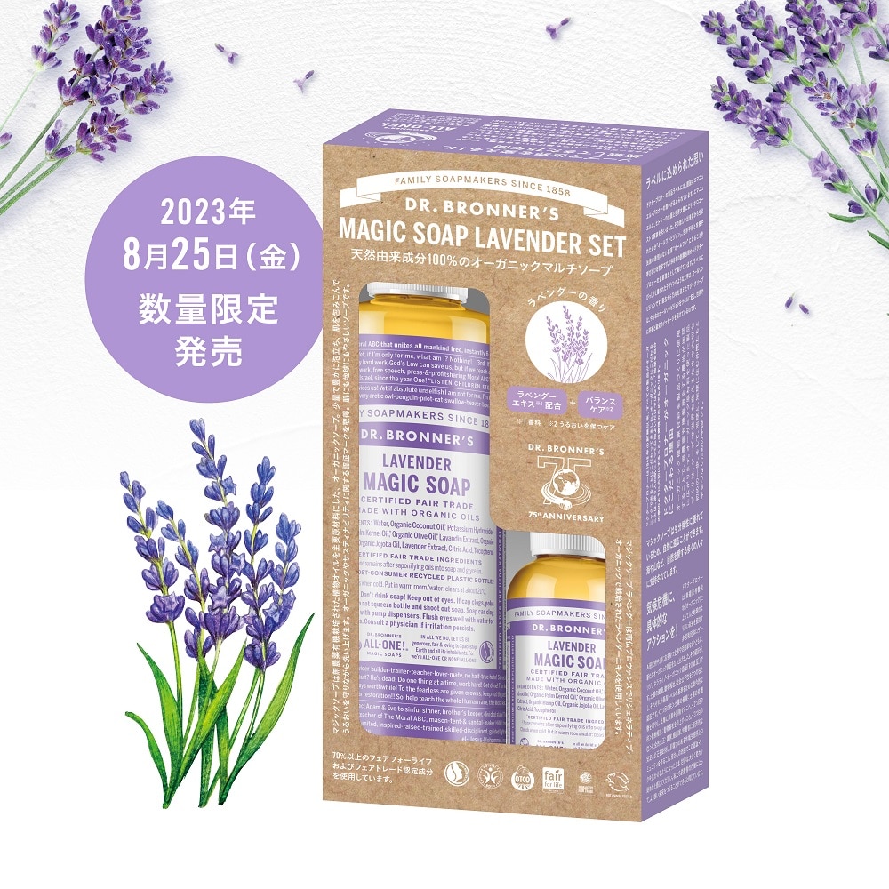 マジックソープSサイズのお値段そのままで、持ち運びに便利なミニサイズがついたお得なセット。限定ボックスには、創業75周年を迎えたドクターブロナーの思いが日本語で綴られています。ドクターブロナーの世界観を存分に感じていただける、今だけ限定のスペシャルなセット。大切な方へのプレゼントにもおすすめです。