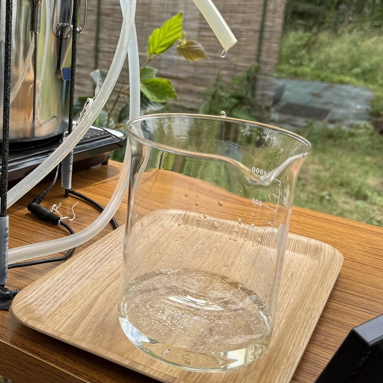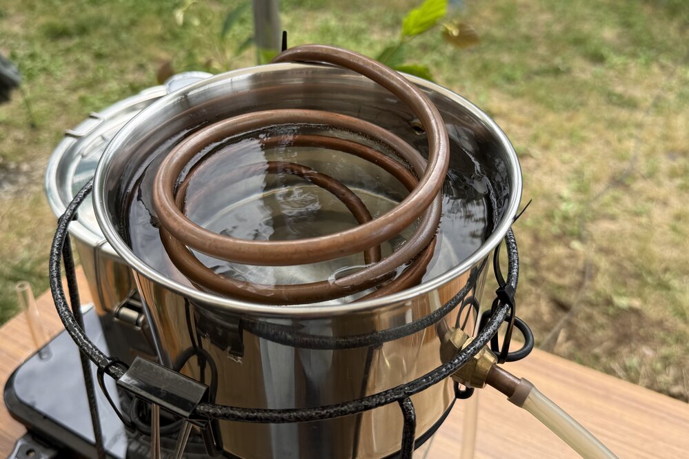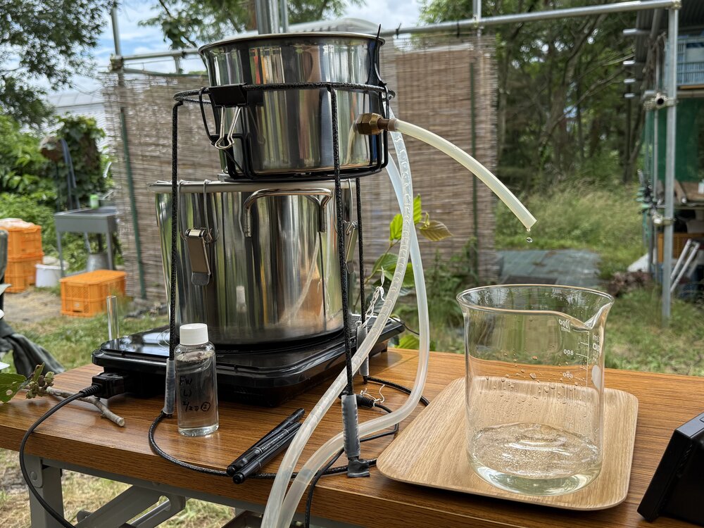 画像の渦巻き状の管が冷却装置。鍋で沸騰させたお湯とこの管との温度差で抽出されます。