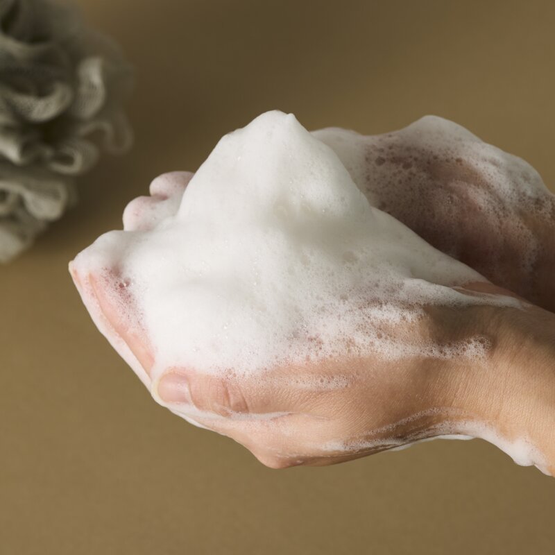 泡立てボールを使うと、ふわふわな泡が立ちました。洗いあがりはつっぱり感なく、しっとりなめらか。