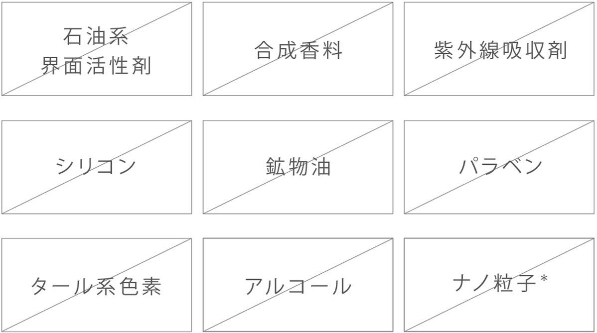 石油系界面活性剤 / 合成香料 / 紫外線吸収剤 / シリコン / 鉱物油 / パラベン /タール系色素 / アルコール / ナノ粒子*