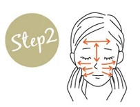 両ほほ、額に置き、顔の中央から外側に向かって広げます。肌に密着させながら均一に伸ばします。