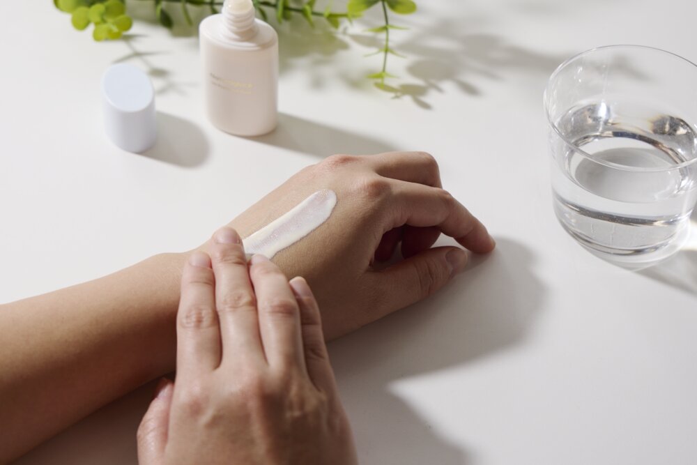 パール粒大の量を手に取ります。少なすぎると全体的にムラになりやすく、多すぎると油分が多くなり化粧崩れの原因となる可能性があります。