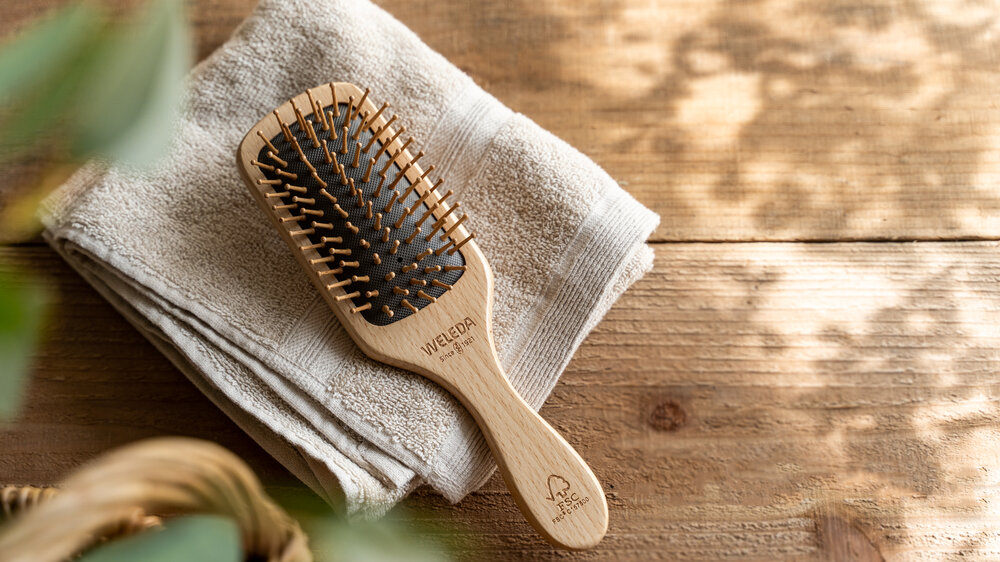スタイリング前のひと手間として、ブラッシングも大切なケアのひとつです。 なかでもヴェレダの「パドルブラシ」は、広い面で髪をとらえながらやさしくとかすことができ、髪への負担も抑えながら絡まりをほどいてくれます。 また、静電気が起きにくいため、乾燥しやすい季節でも髪の広がりやパサつきを抑えながら整えられるのも特長です。髪の流れが自然に整うことで、スタイリング剤も均一になじみやすくなります。 さらに、頭皮にほどよい刺激を与えることで、心地よいリフレッシュ感が得られるのも魅力のひとつ。乾いた髪にはもちろん、スタイリング前や仕上げに取り入れることで、まとまりやツヤのある仕上がりへと導きます。