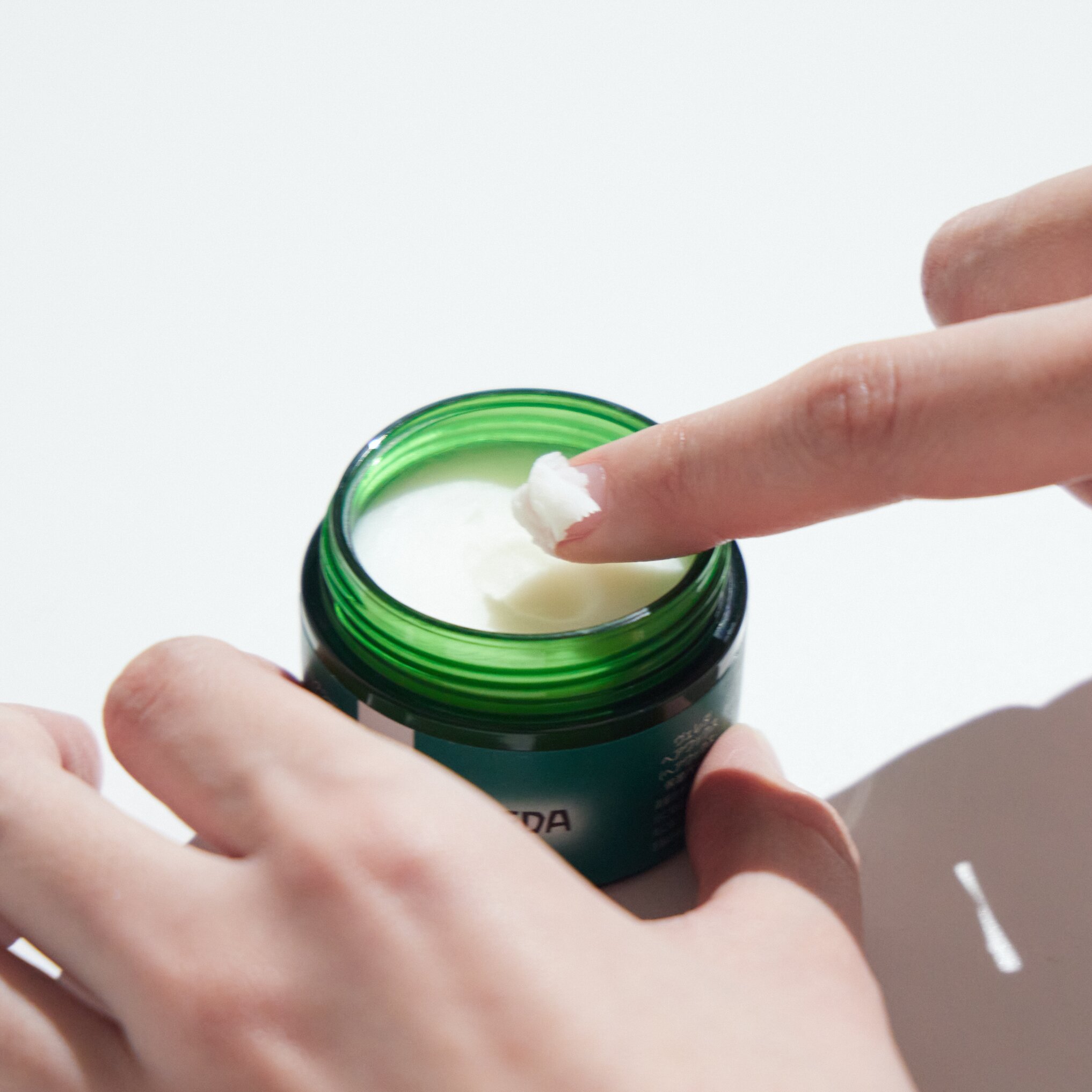 適量を手にとり、手のひらで温めながら固形のバームが透明になるまで十分に伸ばします。