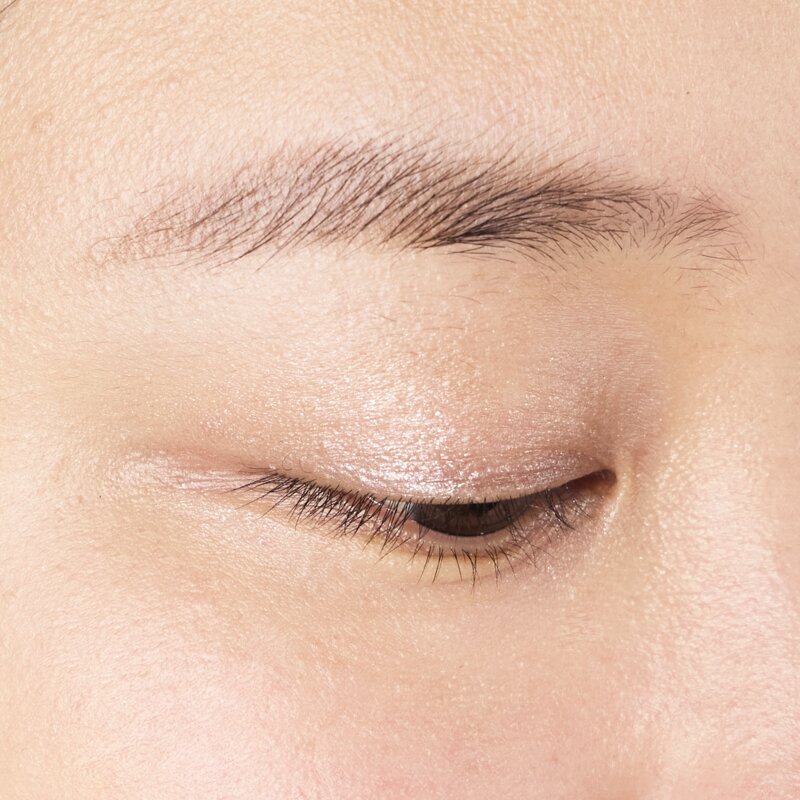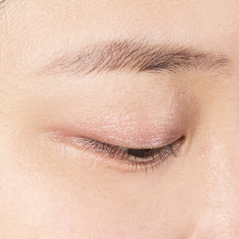 数種類のパールをブレンドした、リッチなきらめきが特長の「01E ルミナスグロー」と、偏光ゴールドパールがさりげなく光るヘルシーな「03E プレイフルピンク」を組み合わせたアイメイク。