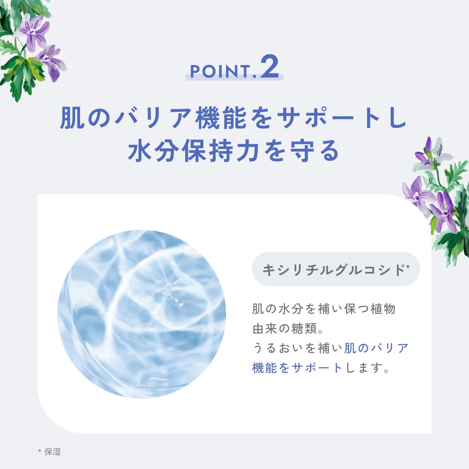 肌の水分を補い保つ、植物由来の成分「キシリチルグルコシド*」を配合。 うるおいを補い、肌のバリア機能をサポートします。
