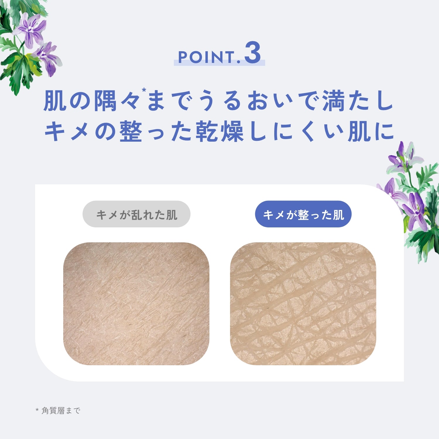 肌の隅々*までうるおいで満たし、キメを整えます。キメが整うことで乾燥がしにくい肌へ。