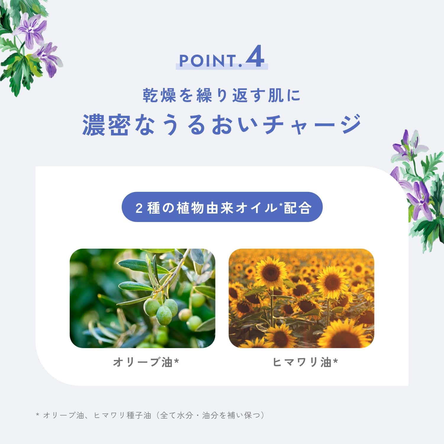 2種の植物由来オイルを配合し、肌に濃密なうるおいを与えます。