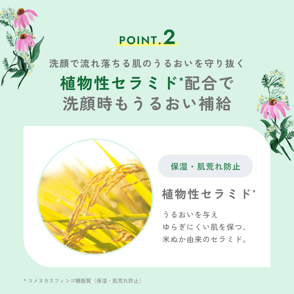天然由来の弱酸性のふんわり泡が、汚れやくすみ*1をしっかりオフ! 美容成分配合、しっとり優しい洗い心地でうるおいキープ。